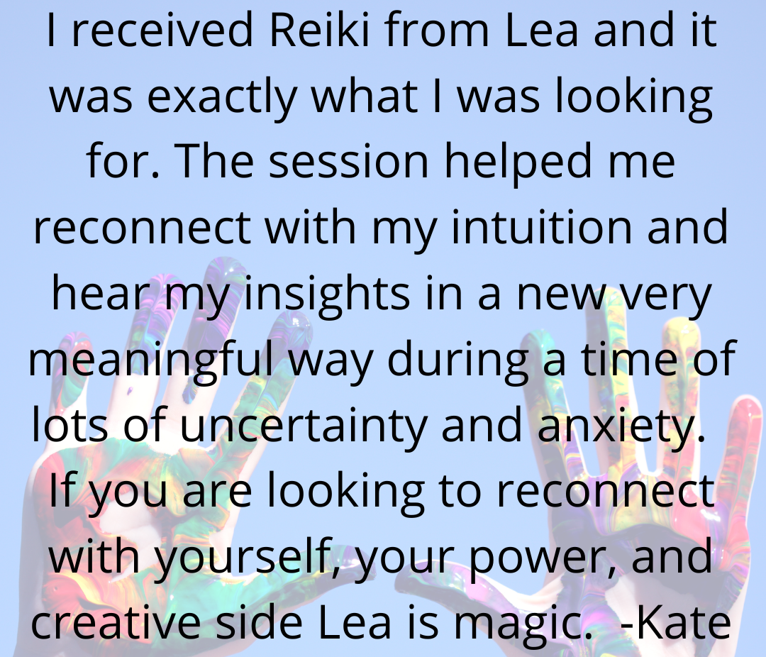 "I cannot say enough nice things about my reiki experience with Lea! From the second I walked in, Lea's calming energy helped me feel comfortable and peaceful. I found her presence to be gentle and grounding. She created a safe space for me to relax and be open to healing. She has a real gift for connecting with people--I felt very trusting and very cared for. I look forward to going back for another visit!" -Kelly